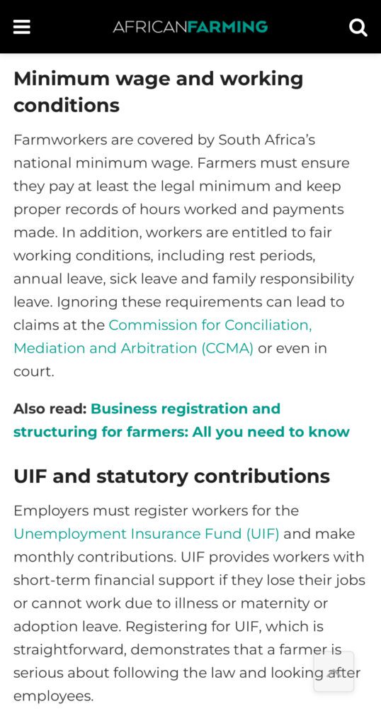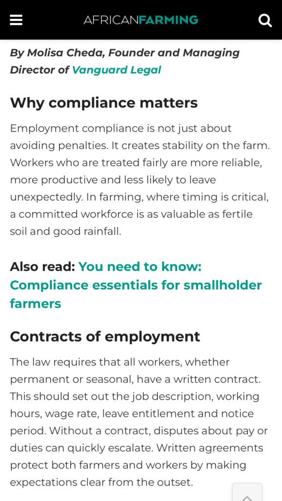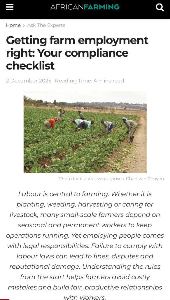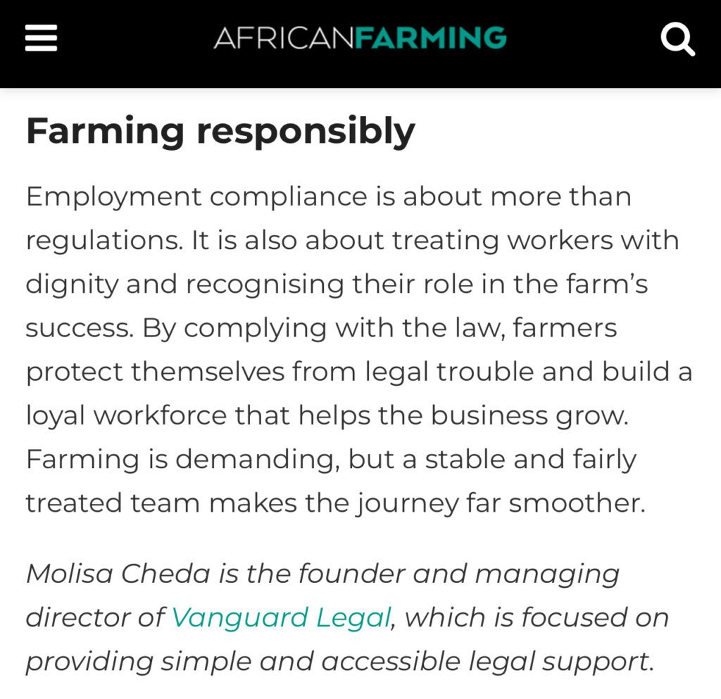 In our latest article featured in African Farming magazine, Molisa Cheda breaks down what every farmer needs to get right when employing workers, from contracts to UIF to safety on the farm.